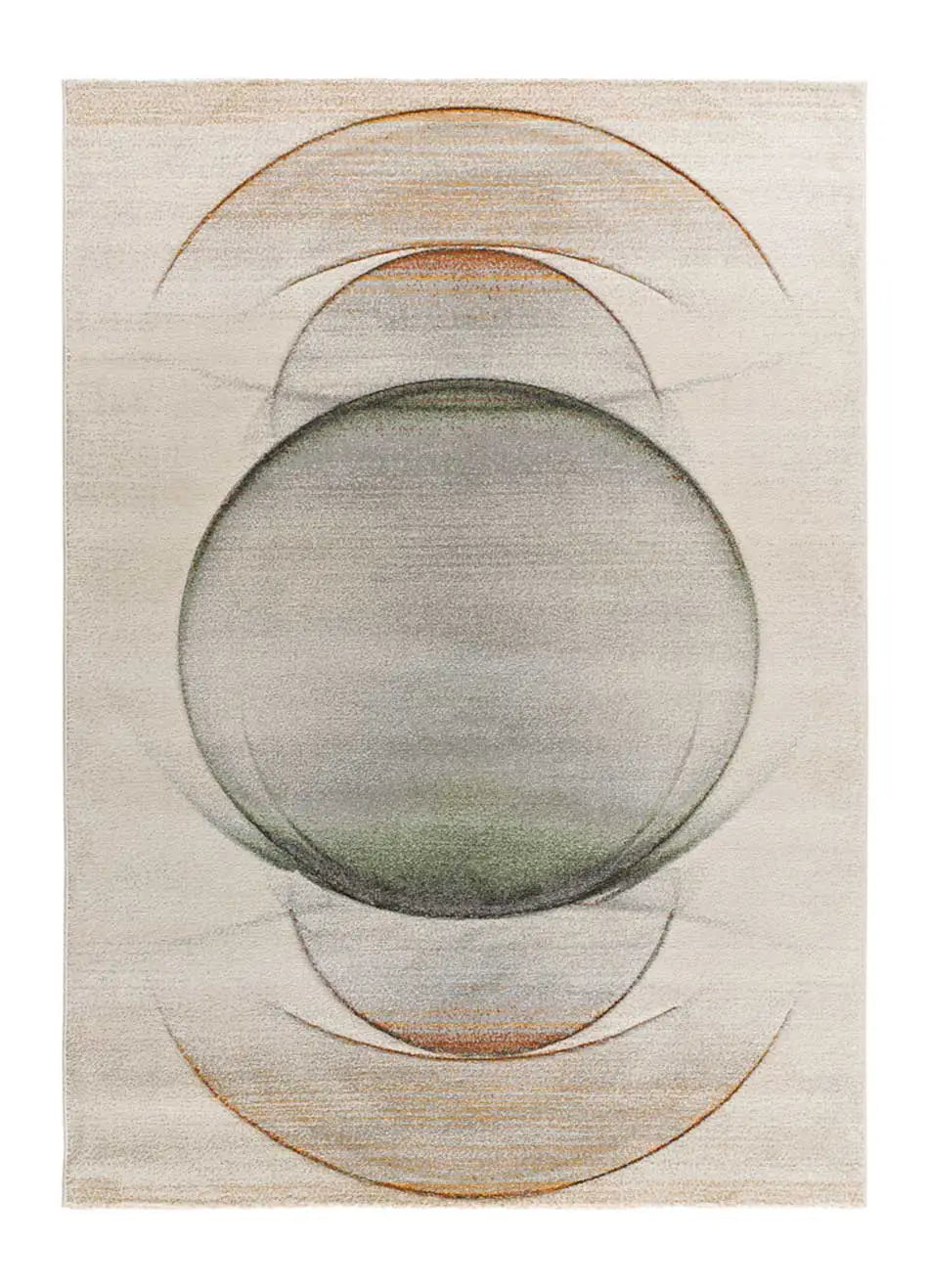 LIBET is a modern rug in beige with geometric shapes in green and orange, providing a unique touch to your home. A rug with a minimalist design, perfect as a living room rug. What are you waiting for!