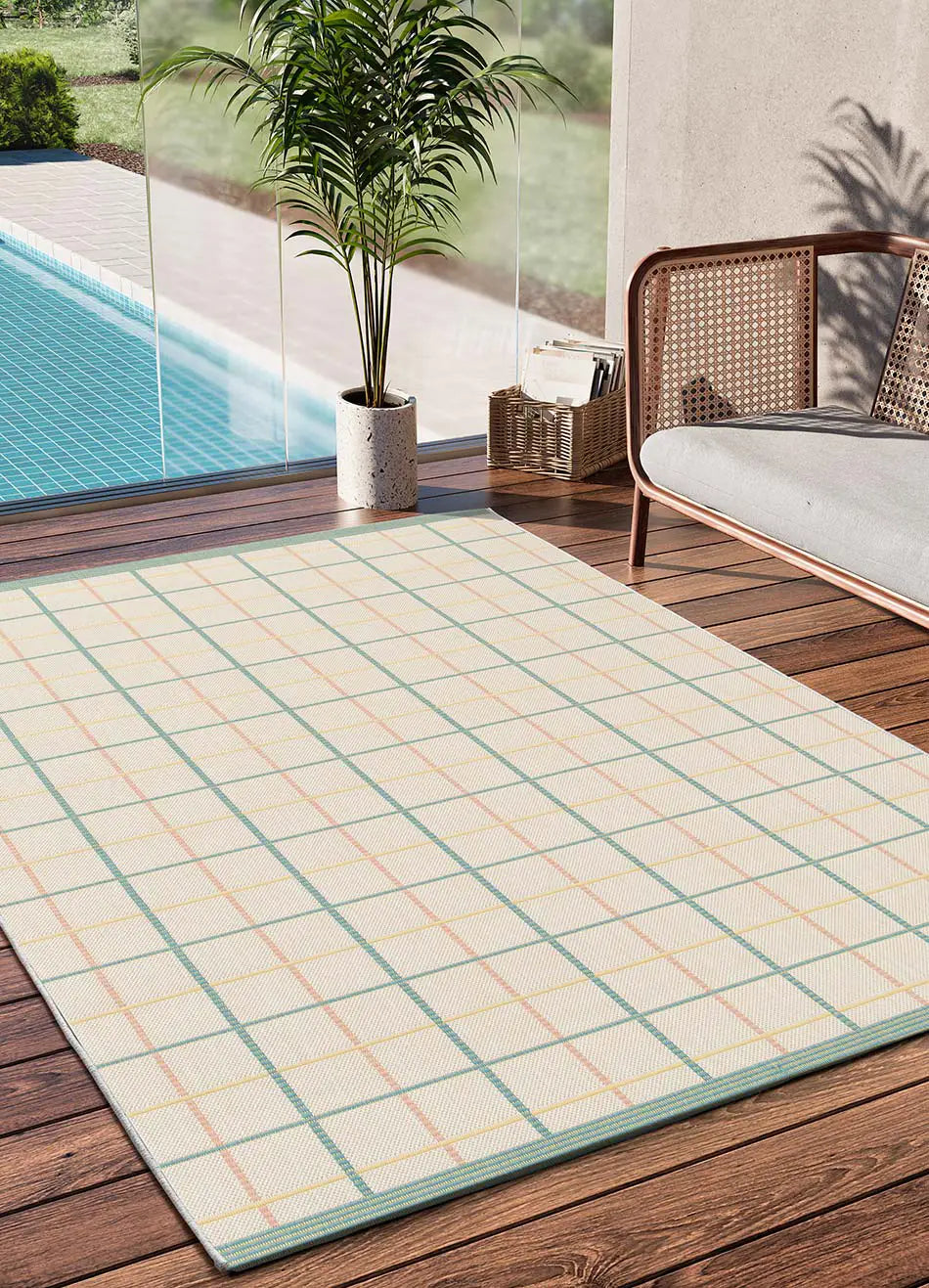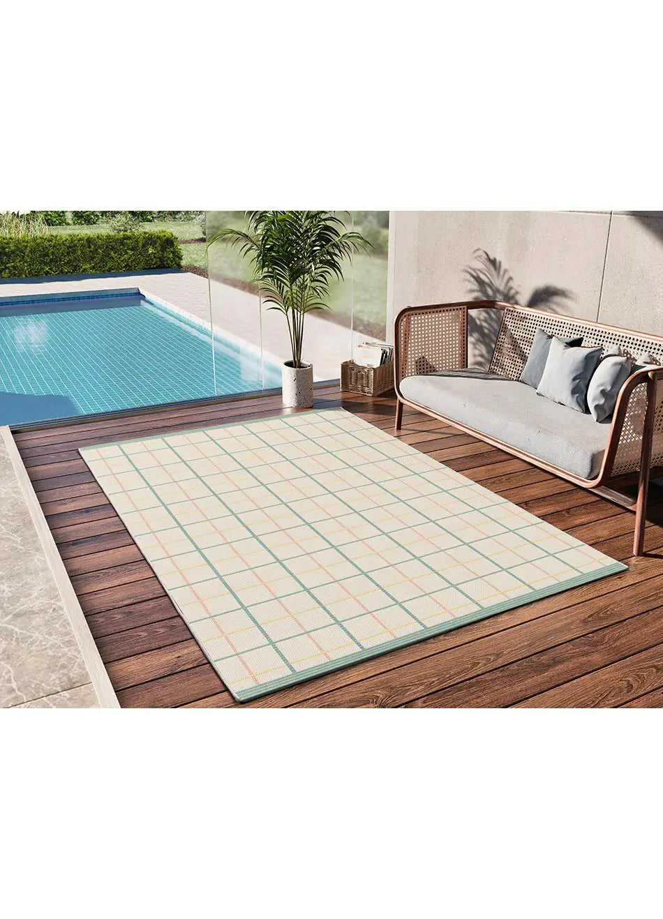 Atticgo Alfombra geométrica de exterior en tonos pastel Manila 17628 ambiente en terraza