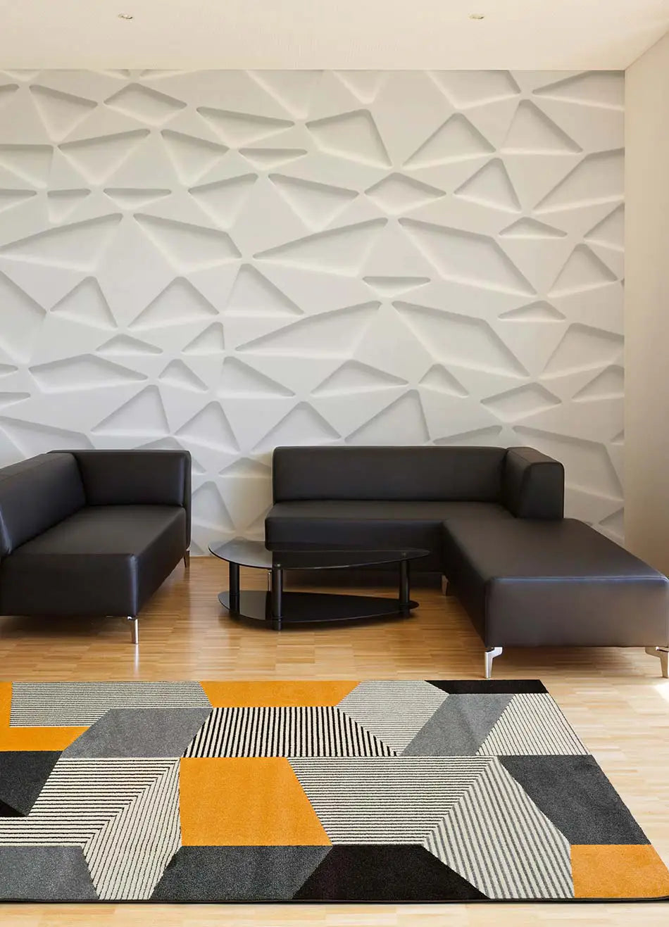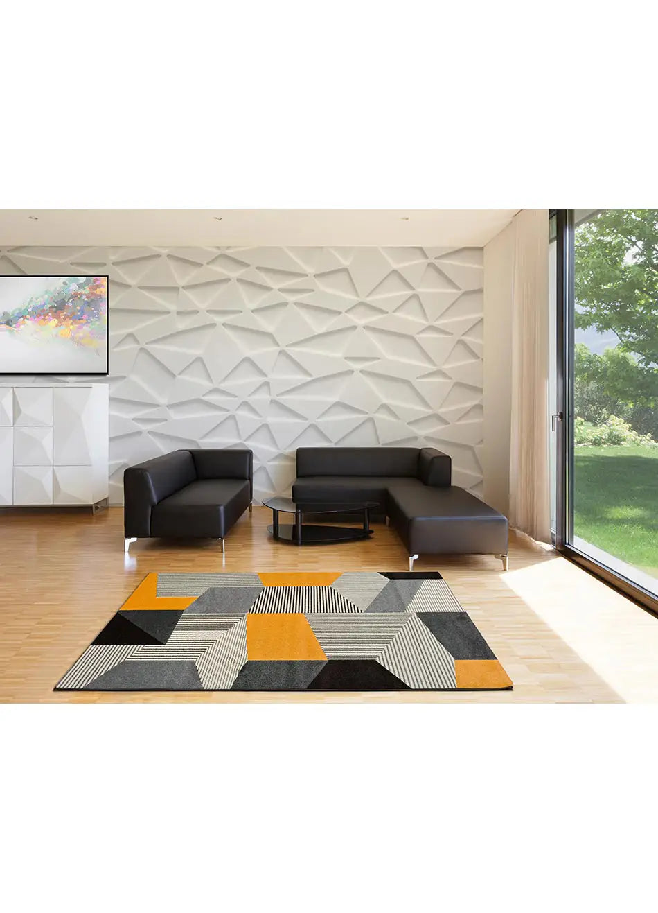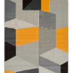 Leo, es una colección de alfombras geométricas de estilo moderno. Diseño en tonos beige, gris y mostaza perfectas como alfombra de salón.