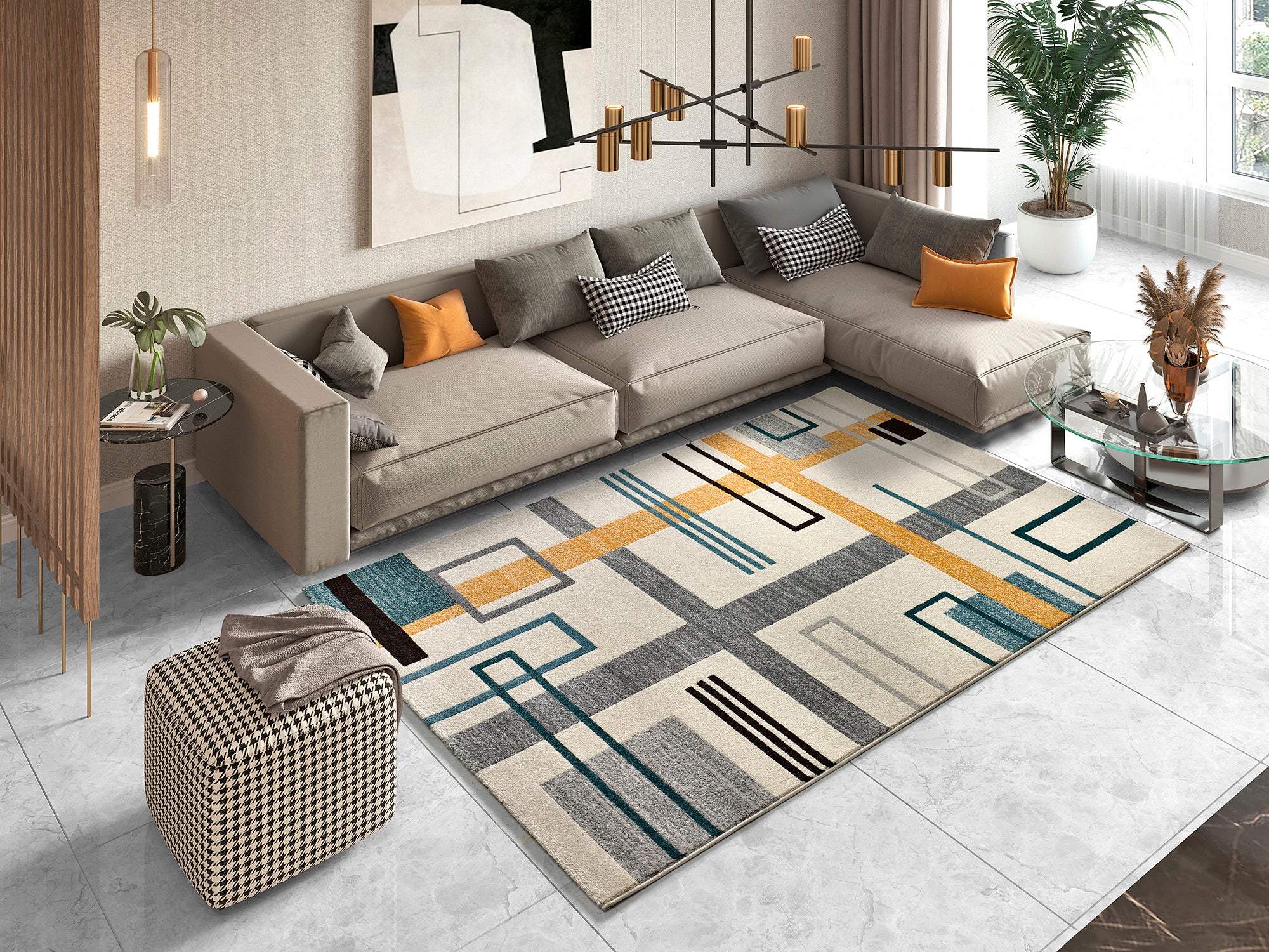 La alfombra Debbi es una alfombra geométrica que se inspira en el movimiento artístico Bauhauss. Una alfombra de pelo corto en tonos crema, grises, mostaza y azules. Su diseño la convierte en una alfombra moderna y actual, perfecta como alfombra de salón o dormitorio.