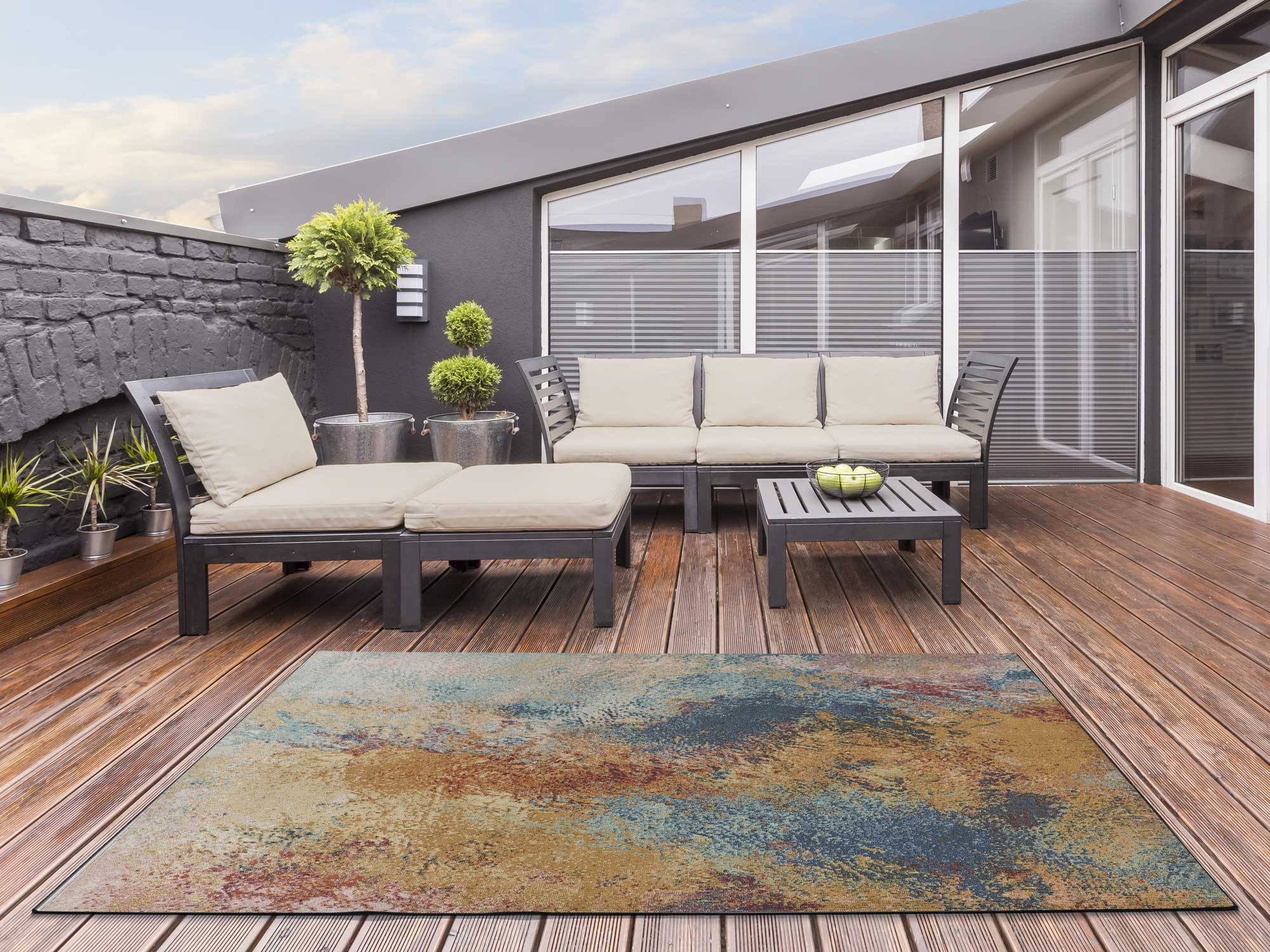 Llena tu casa de color con la alfombra de exterior-interior FANCY. Una alfombra de estilo abstracto en colores empolvados. Una alfombra moderna con toques vintage que se integra a la perfección en cualquier estancia de la casa, como alfombra de terraza por ejemplo.