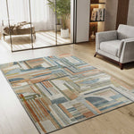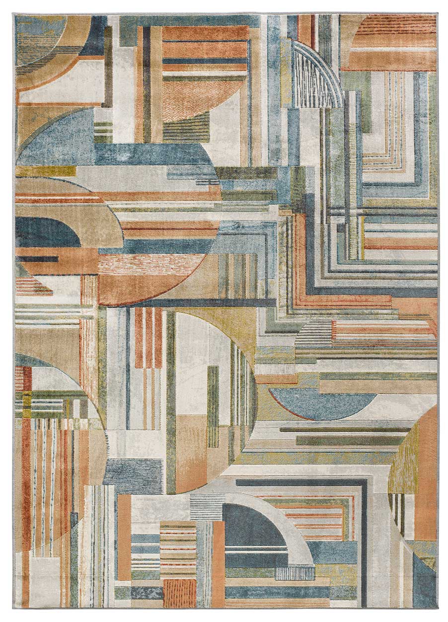 La collection de tapis BLEIK présente des motifs abstraits et géométriques dans les tons kettle, ocre, vert et bleu, en viscose pour un look élégant et moderne, parfait comme tapis de salon !