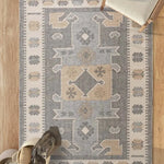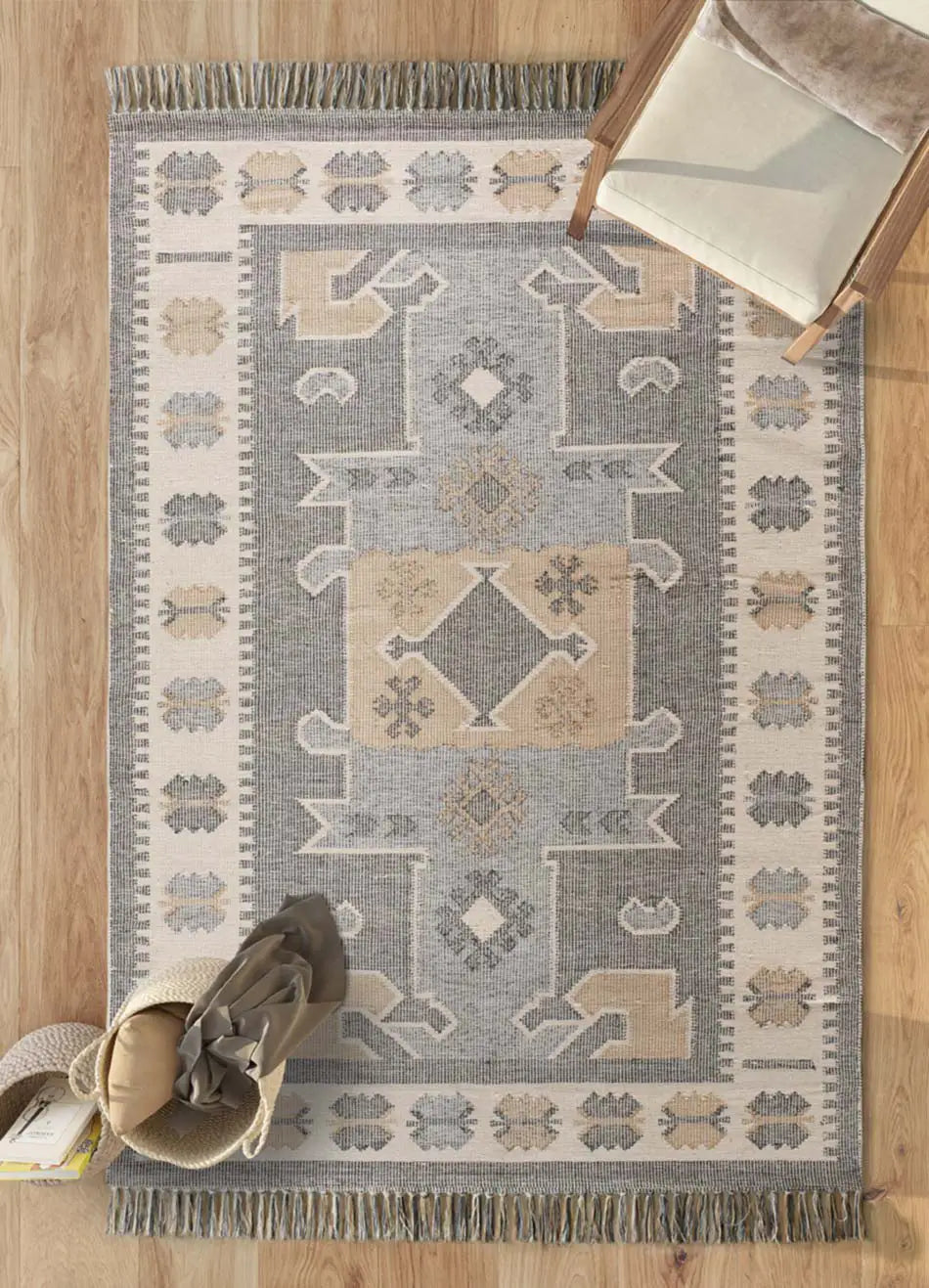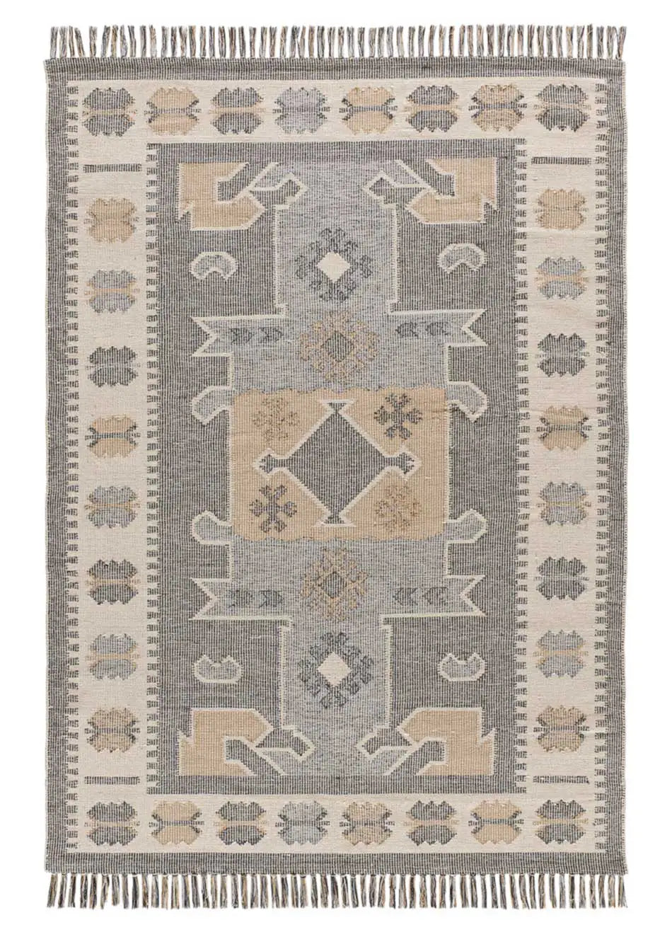 CHANDIA es una alfombra étnica con flecos capaz de transportarte a un lugar remoto lleno de riqueza cultural. Déjate seducir por su aire exótico y disfruta de las tonalidades suaves que aportarán un extra de calidez a la habitación.