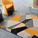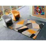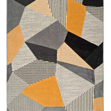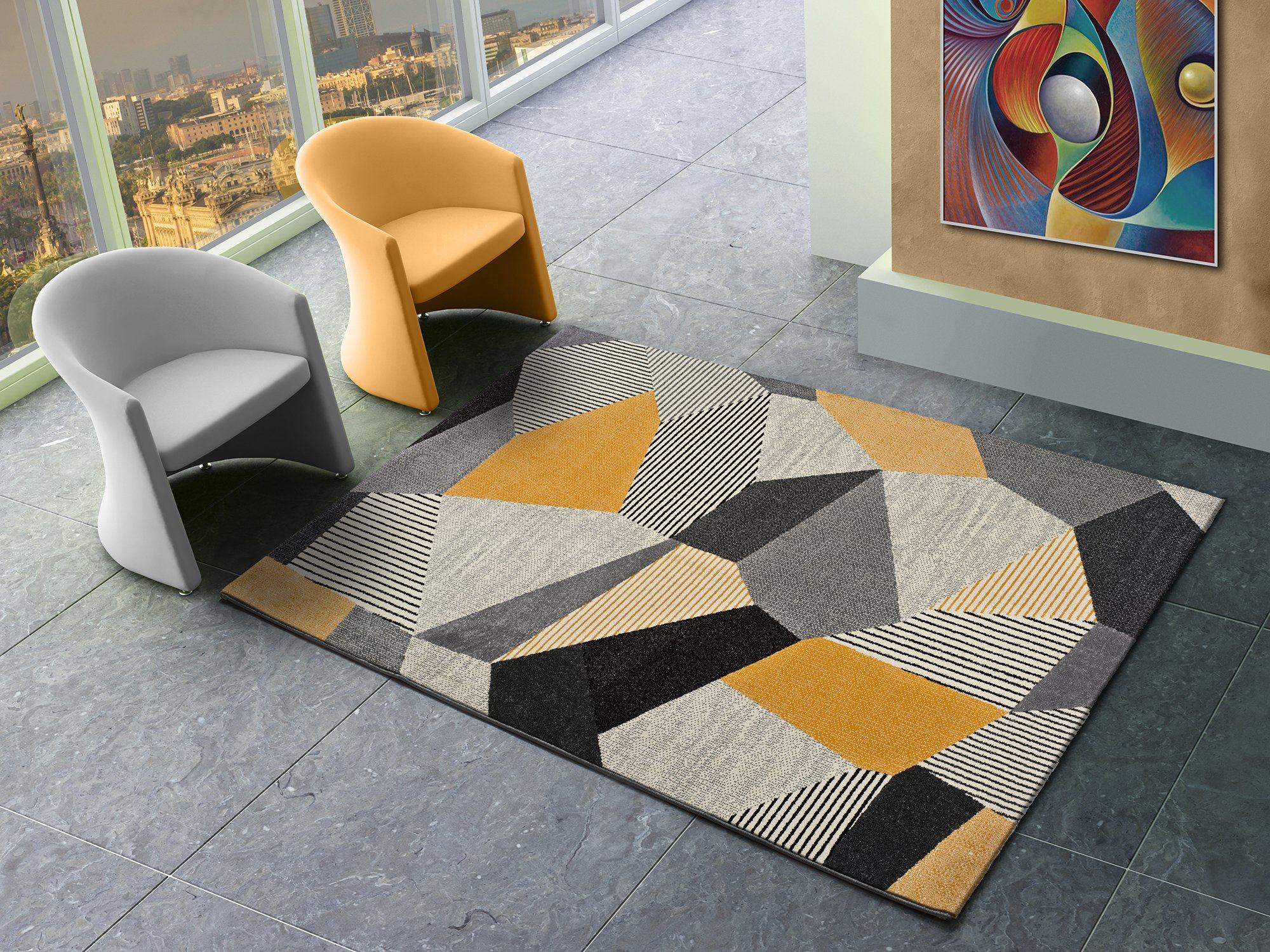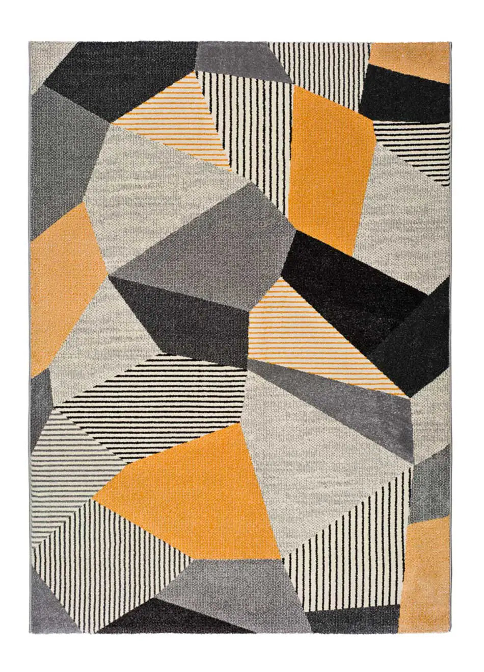 Gladys, una alfombra geométrica en tonos grises y mostaza. Alfombra perfecta para salón y dormitorio presente en los estilos de alfombras modernas.
