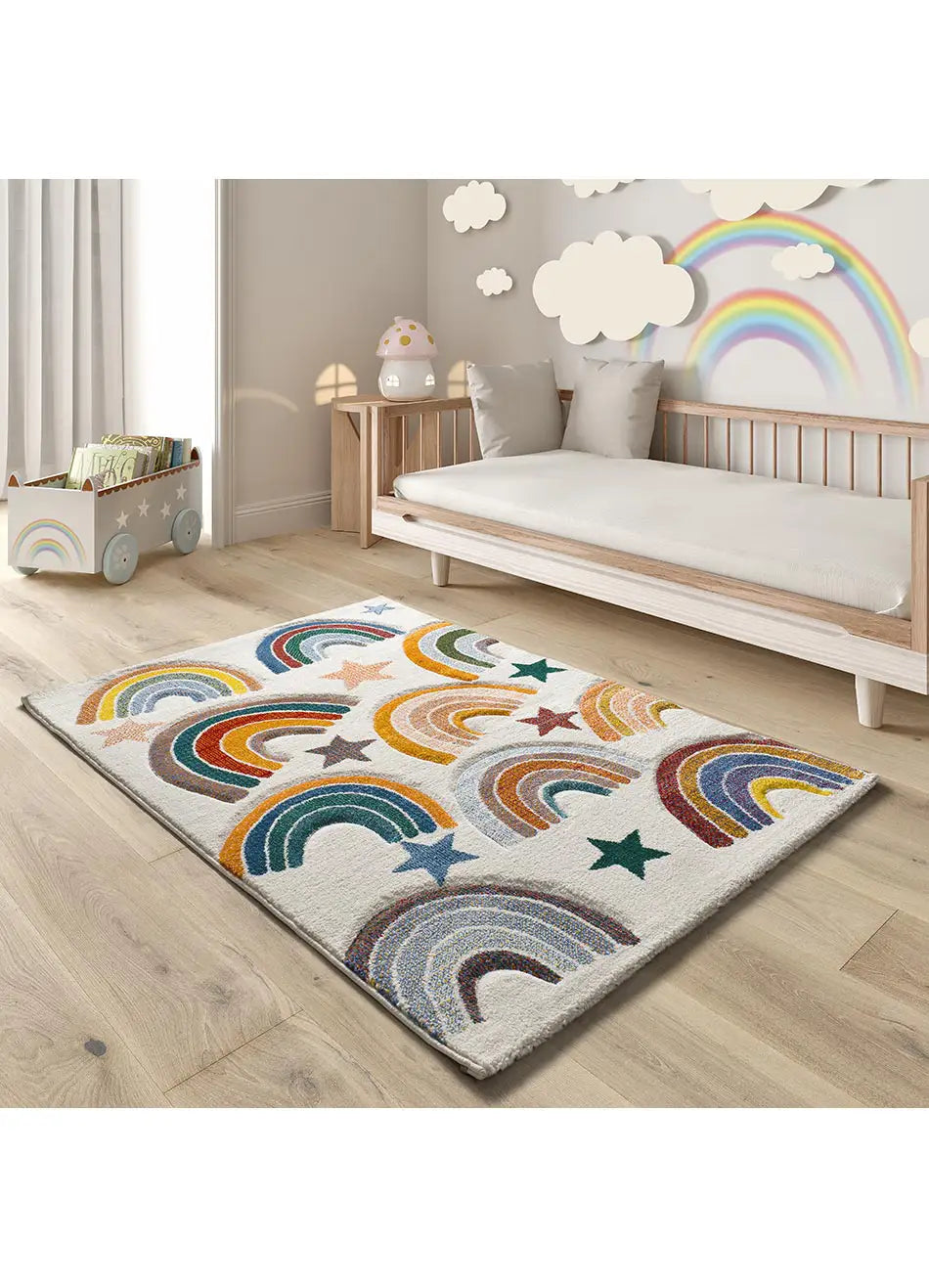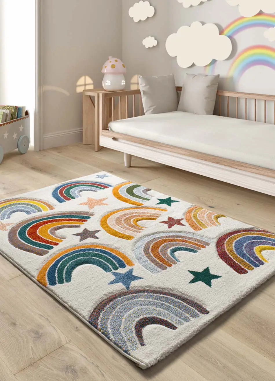 Apuesta por la alfombra infantil Balloon. Diferentes universos de diversión para crear un rincón de aventuras en su habitación. Inspirados en el fondo del mar, el espacio o arcoiris, ideal para estimular la imaginación de tu peque. Esta alfombra de 120X170 cm es perfecta como alfombra infantil.