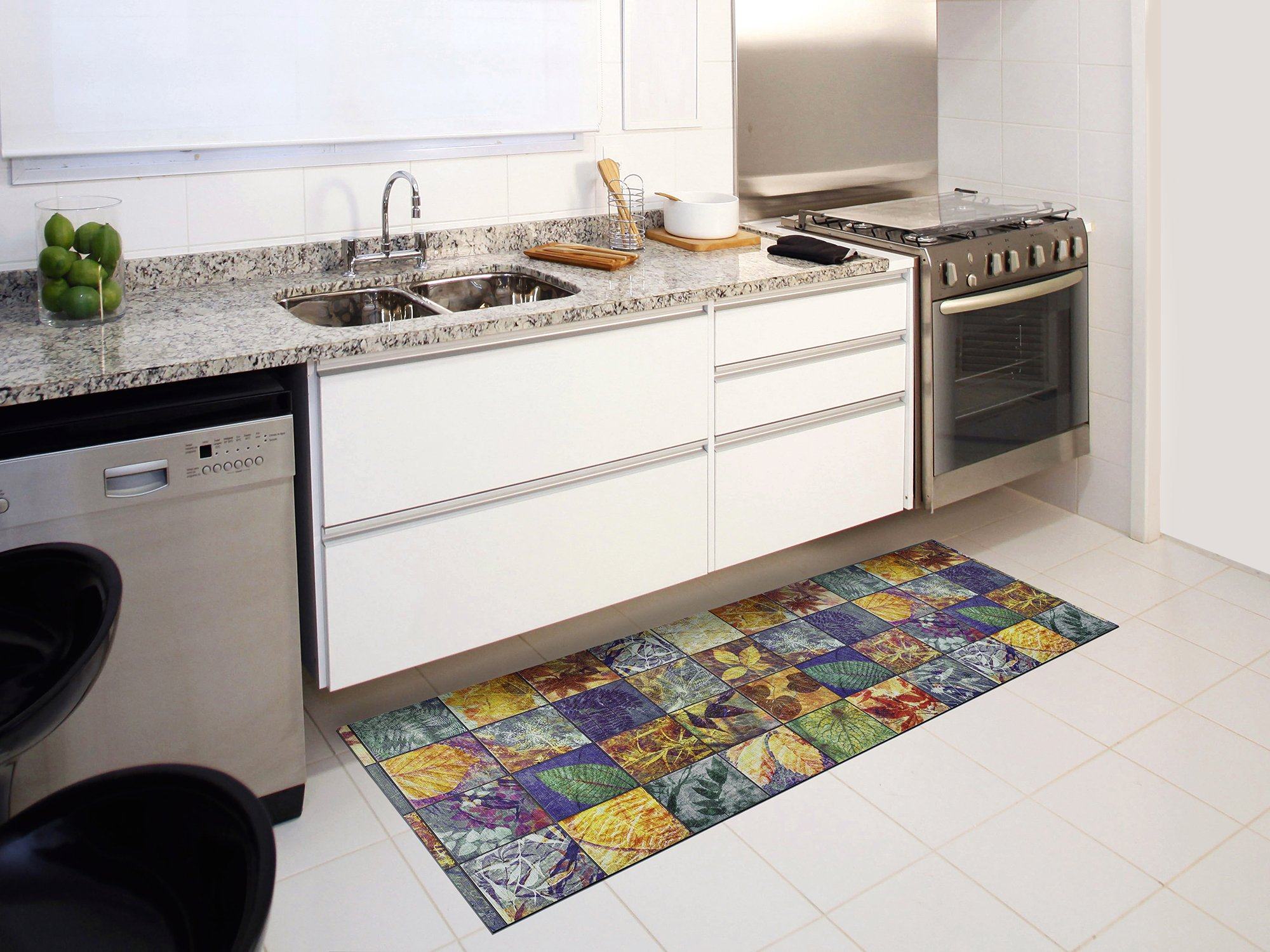 Dale a tu cocina un toque vibrante con la alfombra de cocina Ricci Impressioni que imita baldosas con un delicado estampado otoñal de hojas en tonos tierra, mostaza, verde y azul. Gracias a su diseño lavable, podrás mantenerla siempre impecable con solo un paño húmedo o un ciclo rápido en la lavadora.