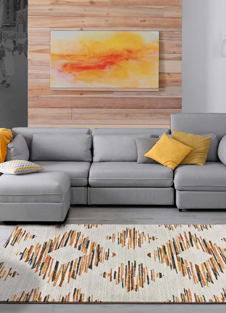 - O tapete Story é um tapete étnico que se inspira nos tapetes Kilim. Um tapete de pelo curto em tons cinza, mostarda e vermelho. O seu design converte-o num tapete moderno e atual perfeito como tapete de sala ou quarto.